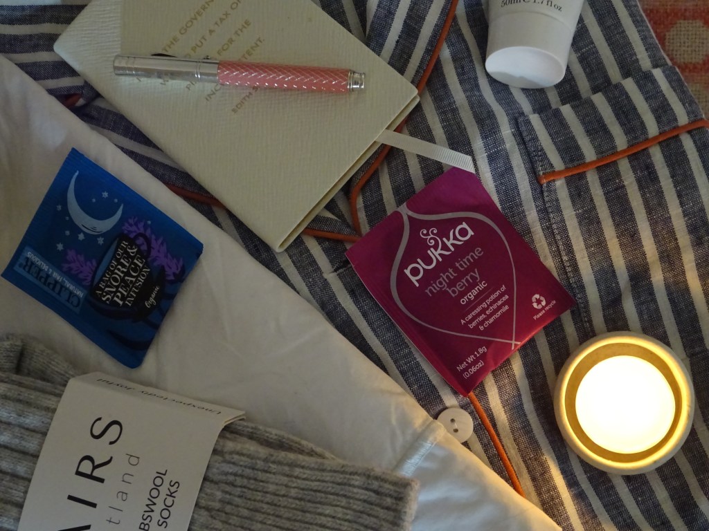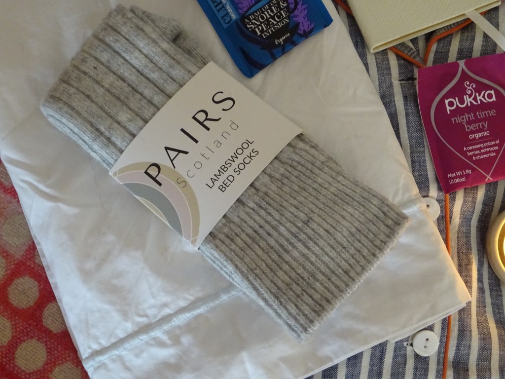 Finally, in nightwear terms, I love a bed sock. Recently I’ve discovered Pairs of Scotland which make exceptionally delightful socks in alpaca, mohair and lambs wool…their bed socks are so comfy and the company promotes the Made in Britain badge admirably. I can’t abide having cold feet in bed – the socks sometimes make it through the whole night on my feet, but more often than not they disappear halfway though.